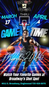 Join us from March 17 through April 4, 2026, to catch all the exciting game action at Broadway’s Shot Spot in Englewood. Experience the thrill of live sports in a vibrant atmosphere. Visit us at 4011 S. Broadway or call 720-428-8878 for more details and game times. #LiveSports #BroadwayShotSpot #EnglewoodEvents