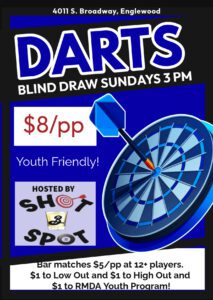 Looking for a great Sunday? Join us at 4011 S. Broadway, Englewood for Blind Draw Darts every Sunday at 3 PM. Entry is just $8 per person. Bar matches $5 per player when we have 12 or more participants. Youth friendly event with contributions supporting the RMDA Youth Program. Come play and have fun!