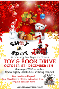 Make a difference! Support our Toys for Tots Toy and Book Drive, Oct 1 – Dec 5. Broadways Shot Spot is collecting unwrapped toys and books.